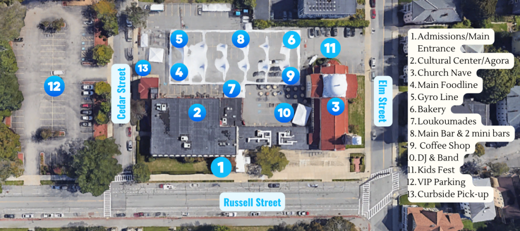 There are two forms of parking for the festival. The first is our VIP parking in a dedicated lot next to the church grounds (number 13 on the map). This comes at a cost. The second is ample street parking that is mostly free. There are many side streets surrounding the church and Elm Park neighborhood that are a short walk from the festivities.